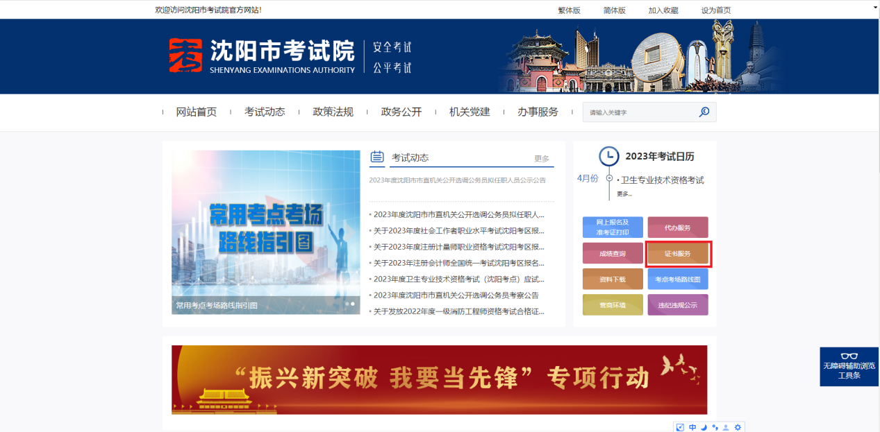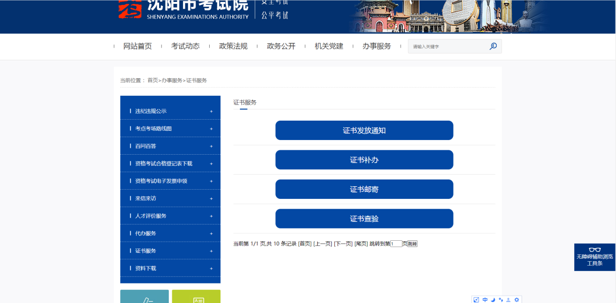 登录沈阳市考试院官方网站,点击【证书服务】