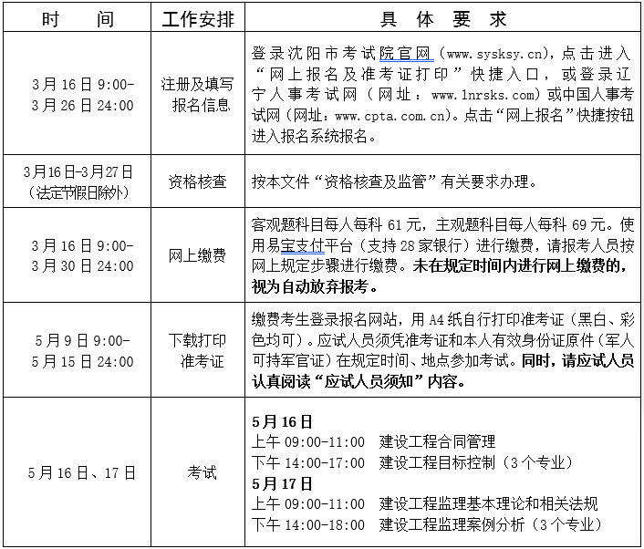 根据辽宁省人事考试中心《关于做好2026年度监理工程师职业资格考试考务工作的通知》(辽人考函〔2026〕10号)精神,为做好2026年度监理工程师职业资格考试沈阳考区报名工作,现将有关事项通知如下: