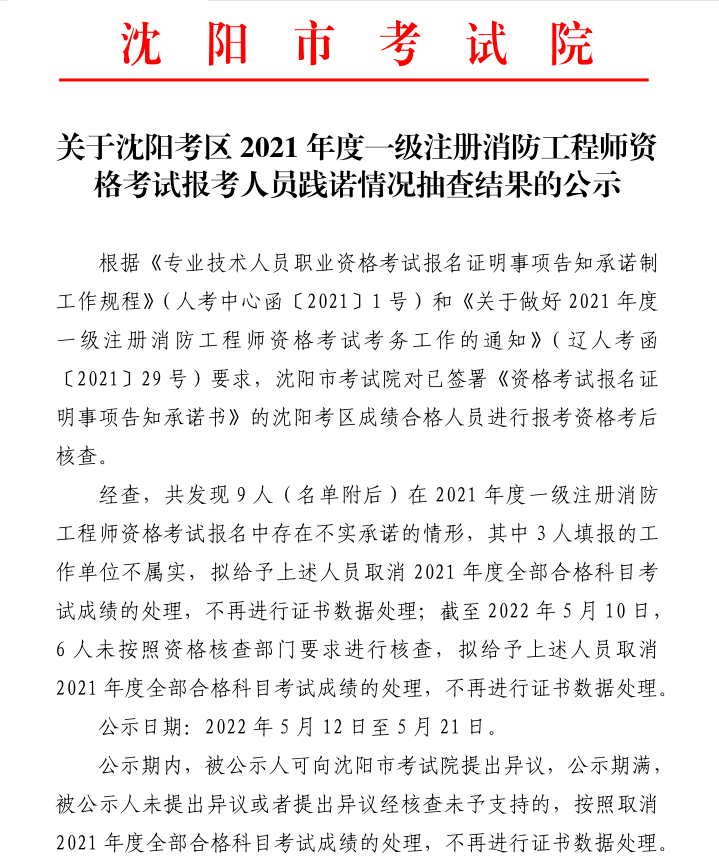 关于沈阳考区2021年度一级注册消防工程师资格考试报考人员践诺情况抽查结果的公示